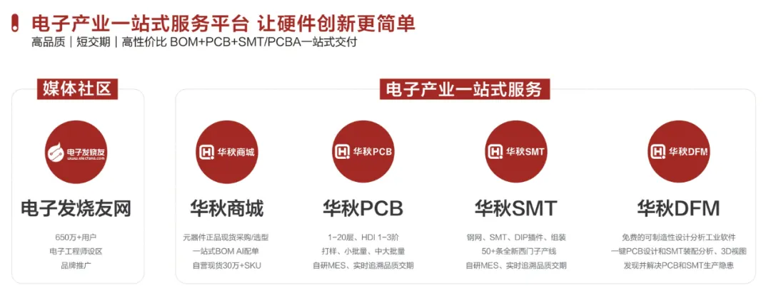 华秋电子,全球领先的产业数字化智造平台,自2011年成立以来,布局了百万工程师社区平台“电子发烧友网”、卓越物联网方案设计能力的“华秋方案”、可制造性设计分析软件“华秋DFM”、高可靠多层板制造平台“华秋PCB”、电子元器件电商“华秋商城”、BOM一键配单/SMT/PCBA服务的“华秋SMT”等电子产业一站式服务平台,全面打通产业上、中、下游,形成电子产业链闭环生态,给行业带来“高品质,短交期,高性价比”的一站式服务。