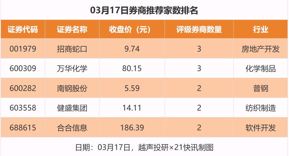 从券商推荐家数来看,3月17日有34家上市公司得到券商推荐,其中招商蛇口获得3家推荐,万华化学获得3家推荐,南钢股份等获得2家推荐。