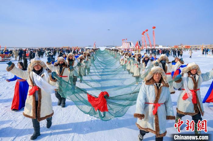 80名渔民头戴皮帽、腰间系红绸分列排开,中间摆放着渔网,举行醒网仪式,期盼捕鱼丰收和风调雨顺。随后,喝壮行酒,开始出发冬捕;此时,非遗传承人齐声唱起长调,祈愿丰收。