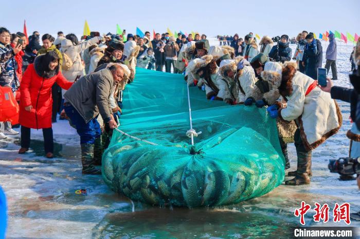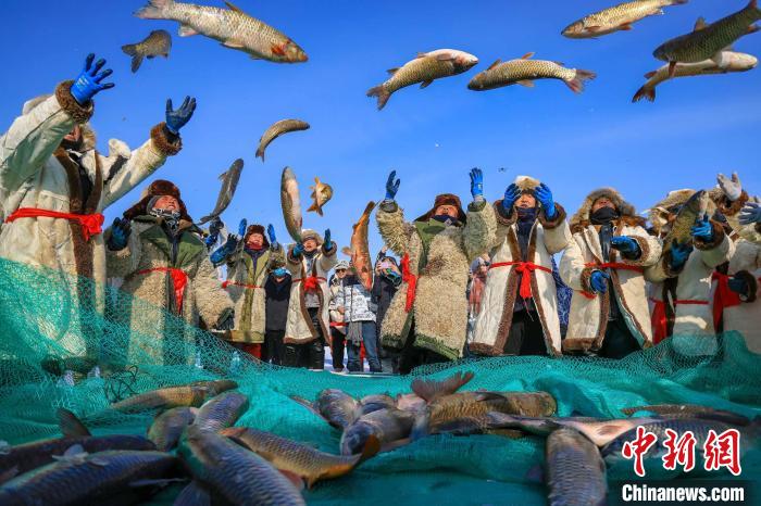 伴随着高亢嘹亮的“起网号子”,渔网越收越紧,并逐渐从冰洞中渐渐滑出,“出鱼了!鱼把头!”一声号子后,平静的水面变得浪花飞溅,活蹦乱跳的鲤鱼、鲢鱼、草鱼等伴随着水汽浮出湖面,“冰湖腾鱼”的壮观场景让游客欢呼雀跃。